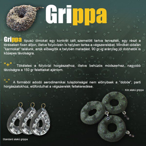 A Grippa bojlis ólom formát mindenki ismeri, sőt általánosnak mondanám a pontyhorgászatban. 100 gr-ig dobható, de efeletti súlytartományban már a behúzós-elhagyós módszerhez ajánlom, ez a bojlis ólom Mocsár zöld és Álca barna színekben pompázik. A barna és a zöld szín régóta a bojlis horgászok kedvenc és általános színei közé tartozik. Ennek a bojlis ólomnak a mérete a behúzós horgászathoz igazodik, mikor nagy távolságokban kell horgásznunk és a szerelékünket elhelyezni bojlizás közben!