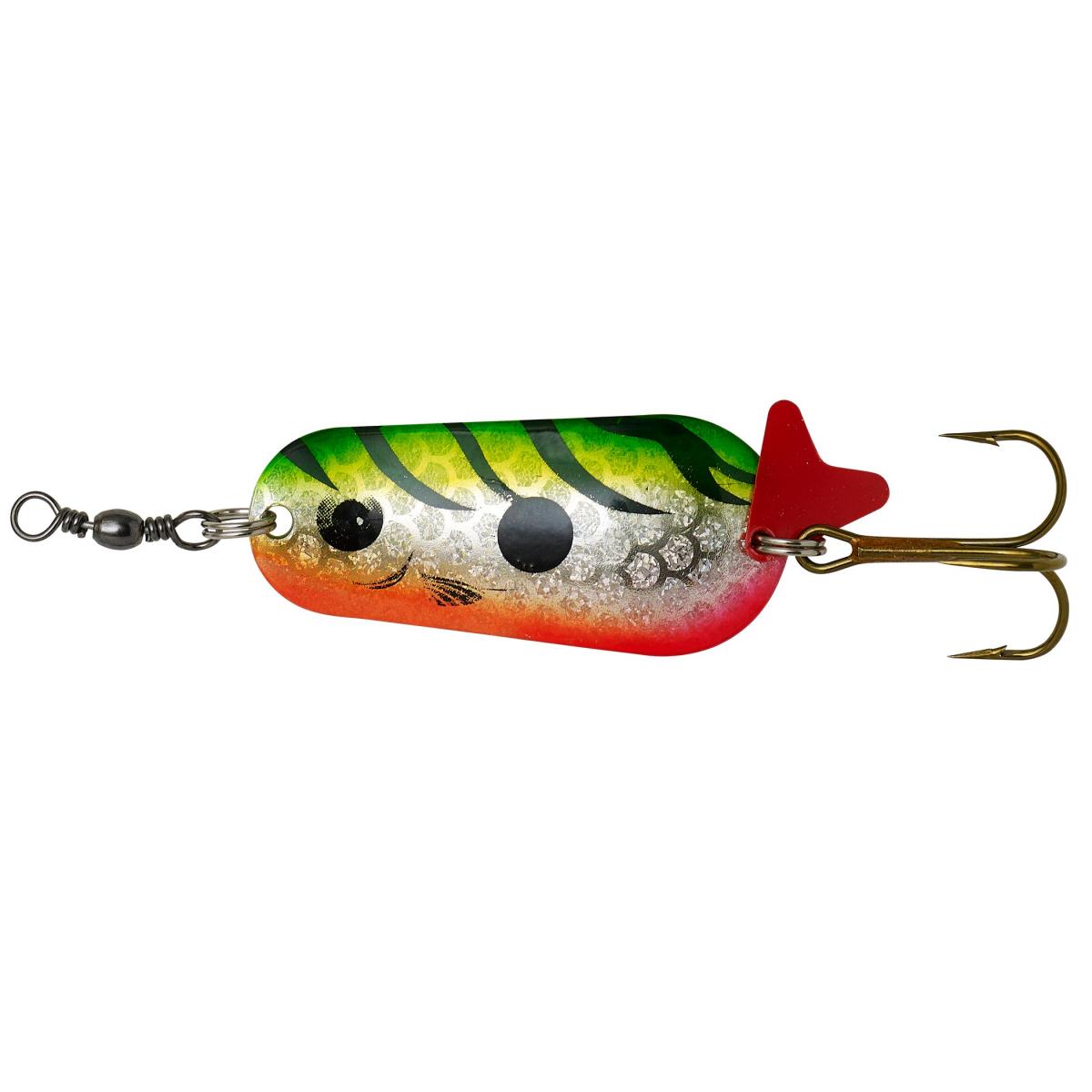 2. Az vonzerőt fokozza a kis piros műanyag lapocska mely a közvetlen a horog felett lett elhelyezve, illetve a villantó hátoldalán található piros csík.