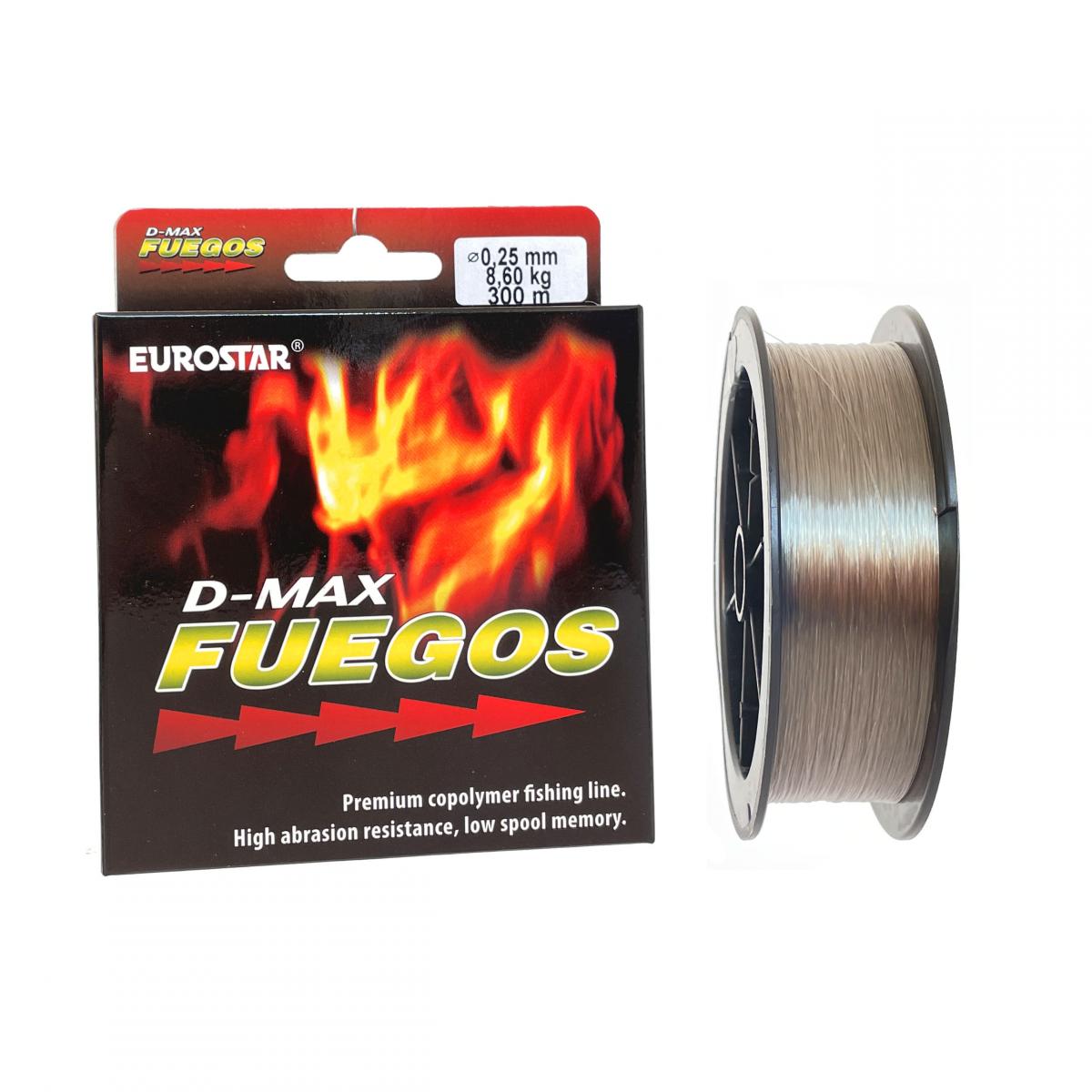 AZ EUROSTAR D-MAX FUEGOS 300m zsinór egy kiváló ár-érték arányú, általános horgászzsinór. Az elődhöz képest tovább tökéletesített zsinór amely minden mai modern követelménynek megfelel. A bevonatoknak köszönhetően UV álló és kopásálló, alacsony a nyúlása, jól köthető, jó csomótűrő. A zsinór sötét zöld színű. A pontyozó horgászat során több csomó megkötésére van szükség, ezért a kiváló csomótűrés elérése volt az egyik fő szempont. Egy speciális bevonat segítségéval érte el a gyártó, hogy a csomózás helyén nem gyengül a zsinór.