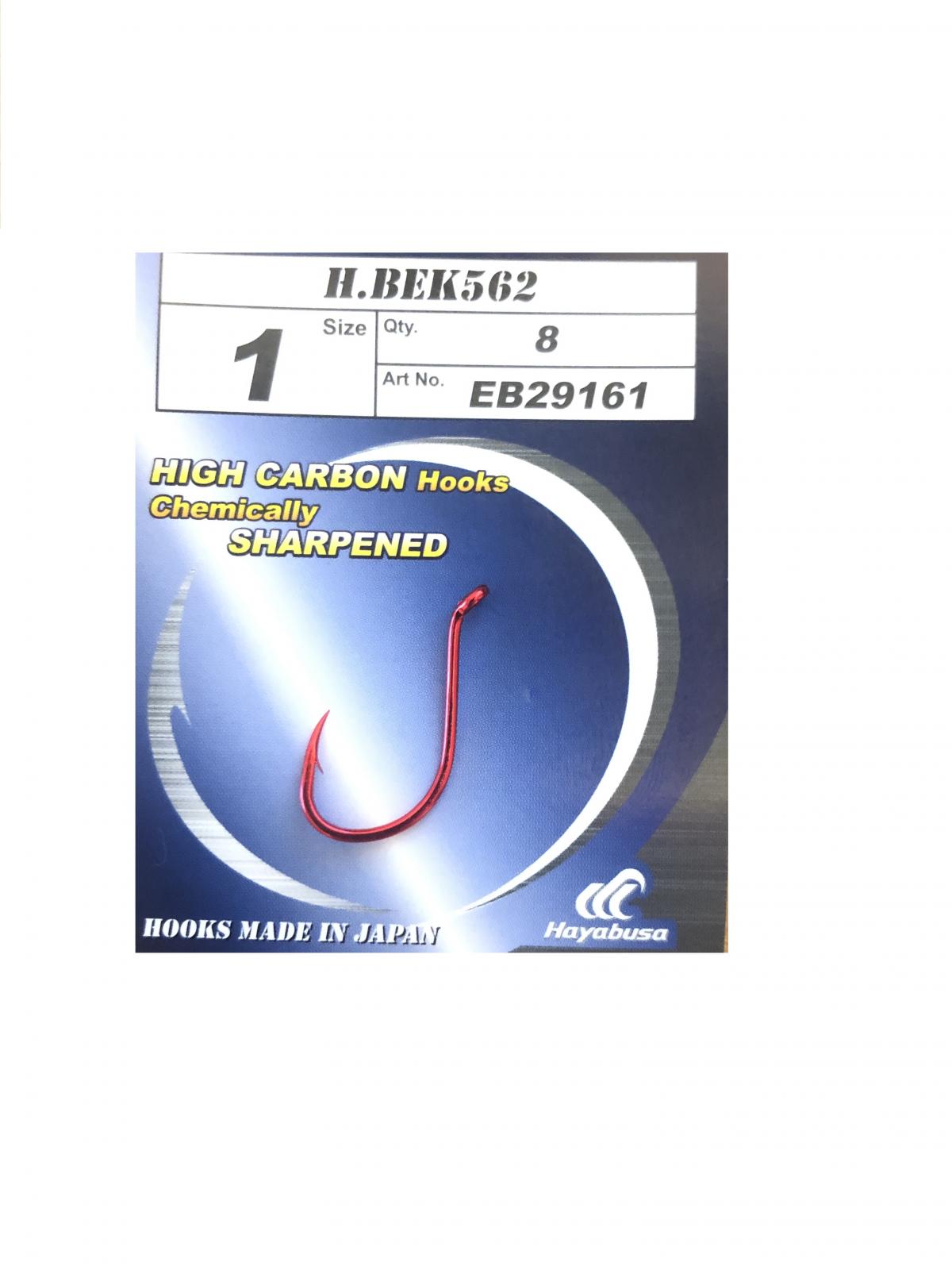 A Hayabusa BEK-562 1-10-ig méretei kifejezetten pontyozásra – keszegezésre kialakított hihetetlenül erős, hegyes horgok. A csökkentett keresztmetszetű horog könnyebben hatol a csontos részekbe. A horoghegyet sajtolással alakítják az egyedi Aero Point formára, tovább növelve a keménységet. A horog hegye enyhén kihajlított ezért biztosabban akad és tart a hal szájában. A klasszikus gömbölyű horogöböl, közepesen hosszú szárban végződik. A horog színe piros. Fonott zsinórral is kiválóan használható, a jól-méretezett erős fülbe könnyedén megköthető akár nagyobb átmérőjű, merev előkezsinór is.