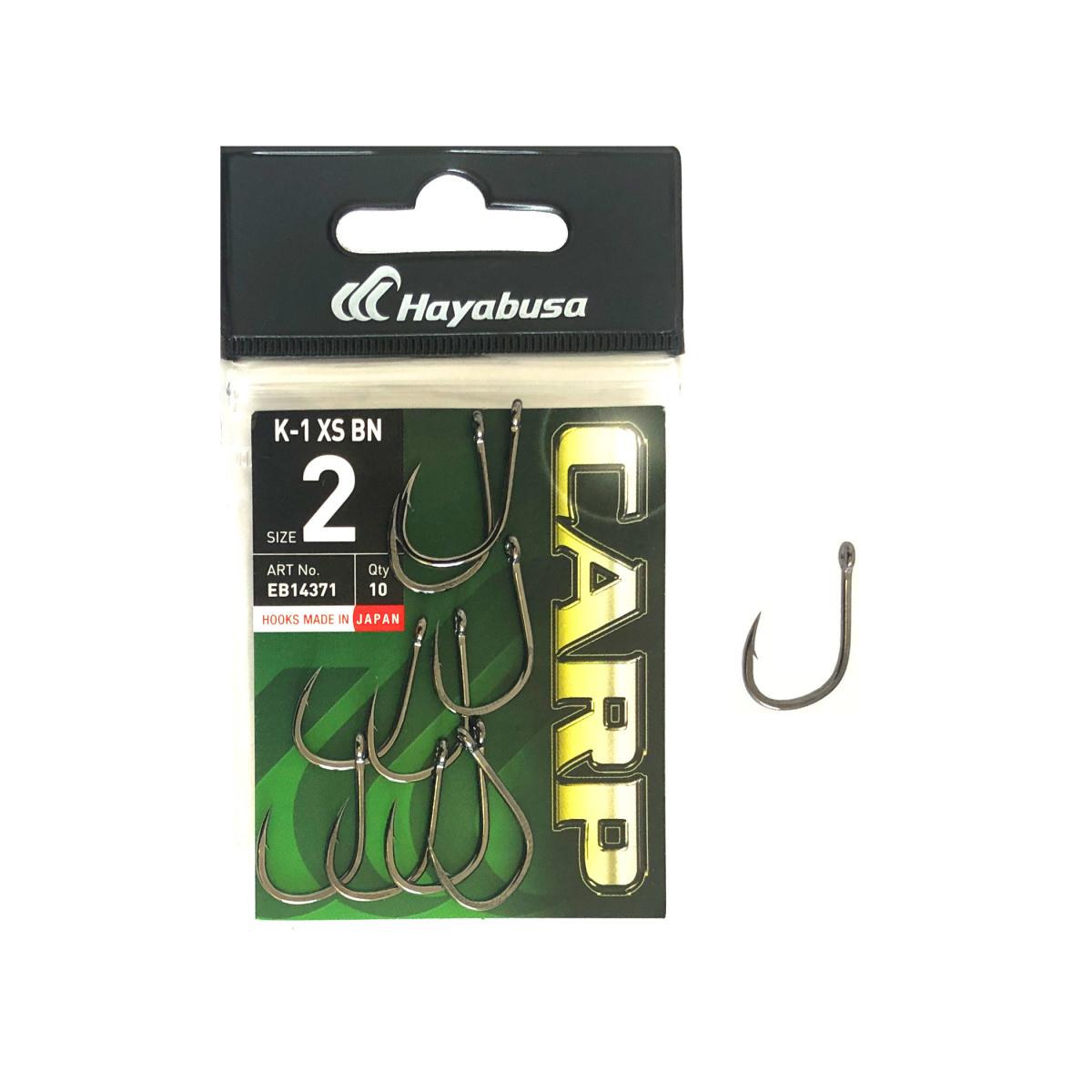 A HAYABUSA népszerű K-1 XS azaz extra-strong(extra erős) sorozata, melyet elsősorban pontyhorgászatra fejlesztettek ki. Kiválóan alkalmazható a hagyományos pontyozó módszerek mindegyikénél, de a bojlis horgászatok során is. A horog black nickel színe (fekete króm) nem csillan meg, nem rontja a csalink álcáját, ami fontos az óvatos, gyanakvó pontyok esetében. A K-1 XS nagy öblű, kerek formájú, erős, vastaghúsú pontyozó horog, amely ideális a nagyméretű csalikhoz, a pelletes és bojlis technikához, a horog szára közepesen hosszú ezért tűzött kemény illetve puha csalikat és fűzött (a horog öbölbe kötve) csalikat egyaránt használhatunk. A K-1 horogtól kb. 20%-al vastagabb ezért ezt a horgot bátran ajánljuk akadós, köves helyekre, hiszen hegye extra tartós ezért nehéz terepen kitűnően megállja a helyét.
