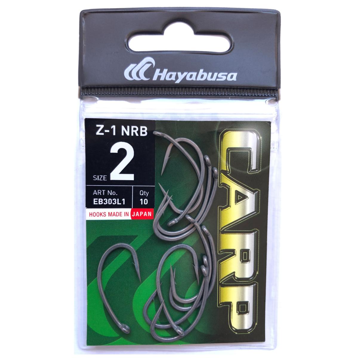 HAYABUSA Z-1 NRB, az eredeti Japánban gyártott, non reflectiv azaz matt csillanás mentes bevonattal ellátott method feeder horog, pontyhorgászathoz. Normál öblű, erős szárú, enyhén kihajtott, közismerten kiváló éltartó tulajdonságú, kémiai élezésű, teflon bevonatú mikro szakálas, füles horog. A horog két oldalról kovácsolt, így a húzó szilárdsága 2-3 szorosa a normál gömbölyű kialakítású horgoknak. Csalitüskés, vagy fűzött csalikhoz ajánljuk, legyen az pellet, wafters, bojli, vagy akár magvak. Négy méretben kerül forgalomba.