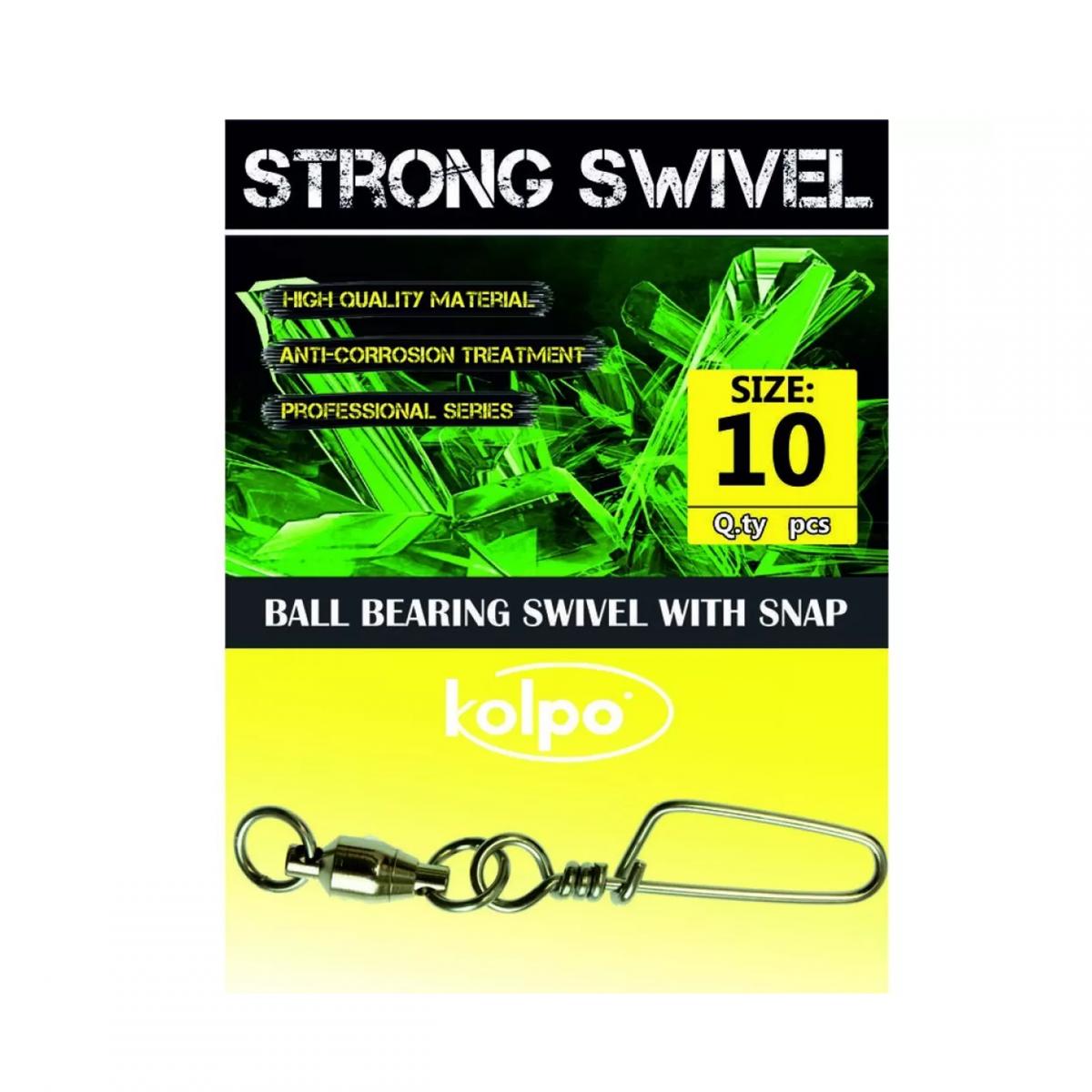 Kolpo Swivel with snap erősített, csapágyas rendszerű forgókapocs. A Kolpo szakemberei kiemelt hangsúlyt fordítanak arra, hogy csakis a legjobb minőségű termékeket kínálják a horgászok számára. A Kolpo forgó a békés és rablóhalas szerelékek nélkülözhetetlen kelléke. A forgó minősége és kivitele tökéletes, a terelhetősége is meg van adva, így garantáltan zsinórunk szakítószilárdságához legmegfelelőbbet választhatjuk ki. A kapocs alakja, kapcsolódási pontjai és csatlakozásai révén rendkívül erős, és megbízható.(ez nem fog véletlenül kikapcsolódni, maximum, ha roncsoljuk). 5 különböző méretben kapható. Terhelhetőségük: 2 – 40,77 kg, 3 – 58,89 kg, 4 – 67,95 kg, 6 – 117,78 kg, 8 – 199,32kg, 1 csomagban 5db forgó található.